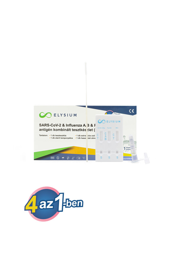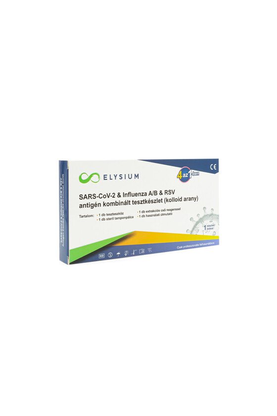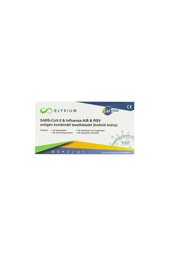 Az Elysium SARS-CoV-2 & influenza A+B & RSV antigén kombinált gyorsteszt orr- vagy szájüregből vett mintából képes kimutatni az új koronavírust, az influenza A és B típusát, valamint az RSV fertőzést is. A 15 perc alatt kényelmesen elvégezhető teszt rendkívül gazdaságos, hiszen egyetlen tesztkészlettel 4-féle fertőzésre is tudunk tesztelni, miközben kétféle tesztelési eljárás közül is választhatunk. A koronavírus, az influenza, valamint az RSV okozta megbetegedések megkülönböztetése sokszor egészségügyi szakemberek számára sem könnyű feladat. A professzionális felhasználásra készült Elysium 3 az 1-ben antigén kombinált gyorsteszttel egyszerűen megállapítható, hogy melyik fertőzésről vagy fertőzésekről van szó.